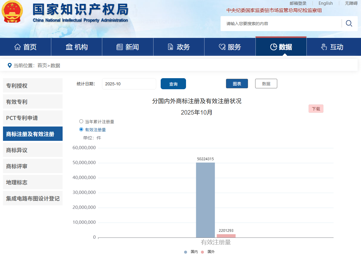 普益知产在国家知识产权局检索得知,截至2025年10月我国国内有效注册商标量已突破5000万件大关。